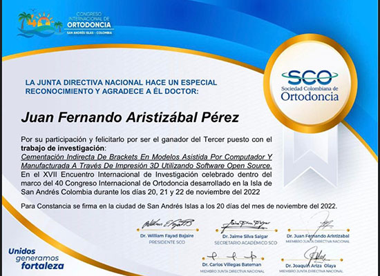 Tercer puesto trabajo de Investigación: Cementacion indirecta de Brackets en modelos asistida por computador y manufacturada a través de impresión 3D. Ecuentro Internacional de Investigación Sociedad Colombiana de Ortodoncia, San Andres Noviembre de 2022.